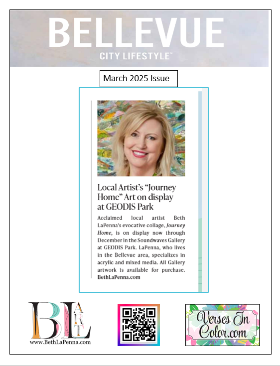 I’m honored to be featured in the March 2025 print edition of Bellevue City Lifestyle, which highlights my mixed-media collage Journey Home and my work as a Bellevue-area artist.
